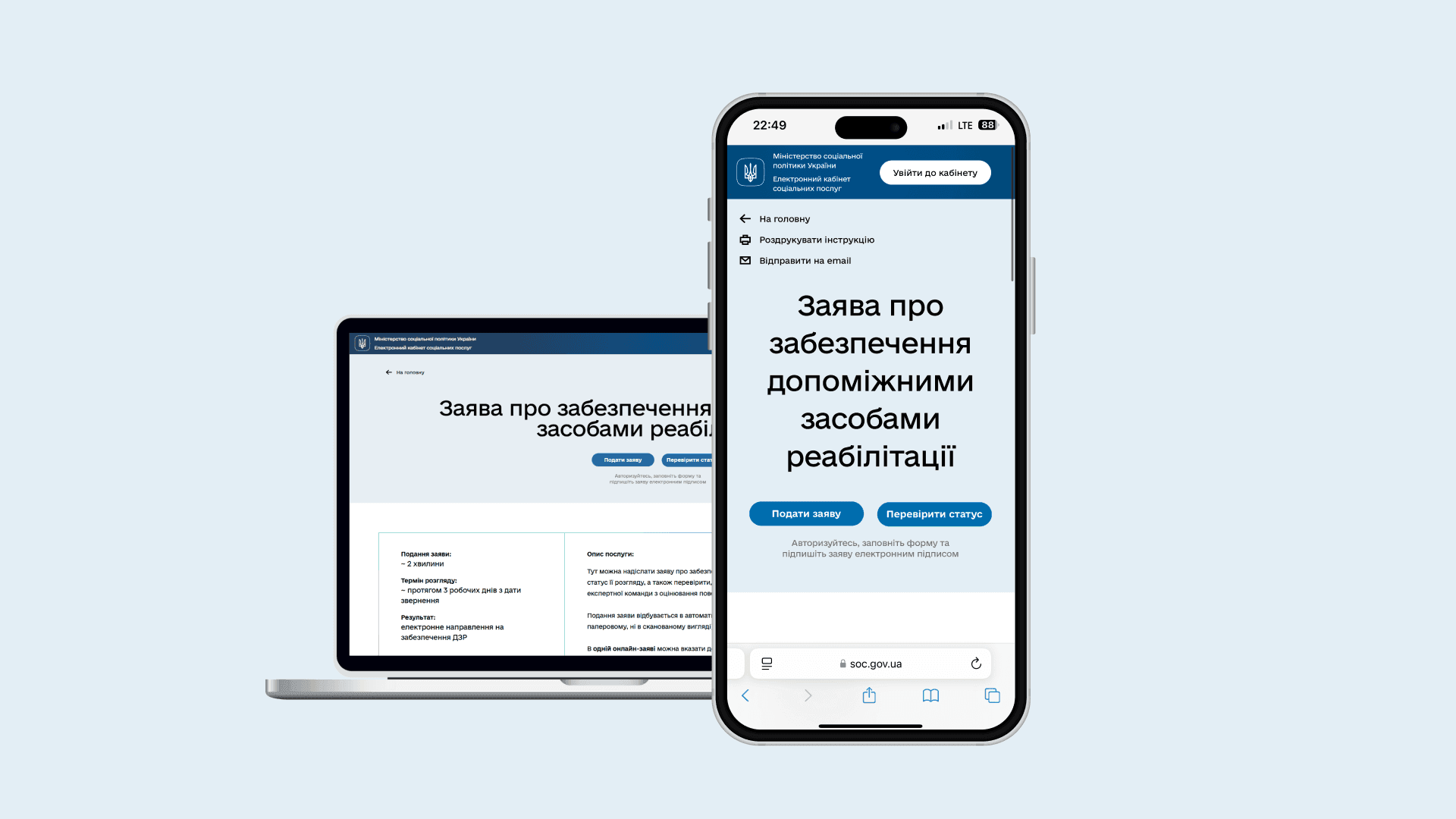 Такий сервіс дозволяє подавати не лише заяву на отримання засобу реабілітації, а також заявку до обраного підприємства. Крім того, можна подати заяву про виплату компенсації за самостійно придбаний виріб — функція тимчасово недоступна на Соціальному порталі Мінсоцполітики.