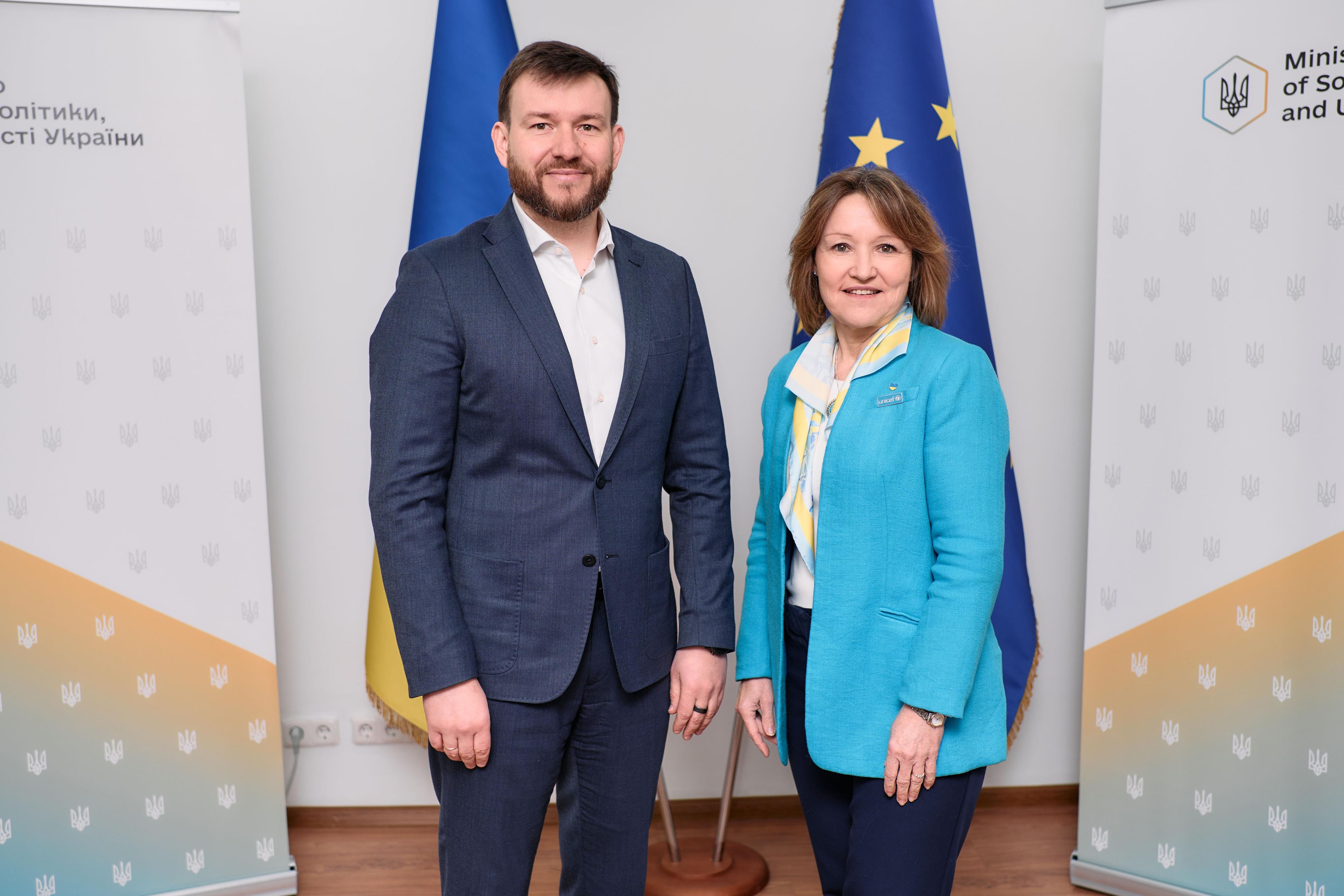 Міністр соціальної політики, сім’ї та єдності України Денис Улютін провів першу офіційну зустріч із новопризначеною головою Представництва ЮНІСЕФ в Україні Анн-Клер Дюфей.